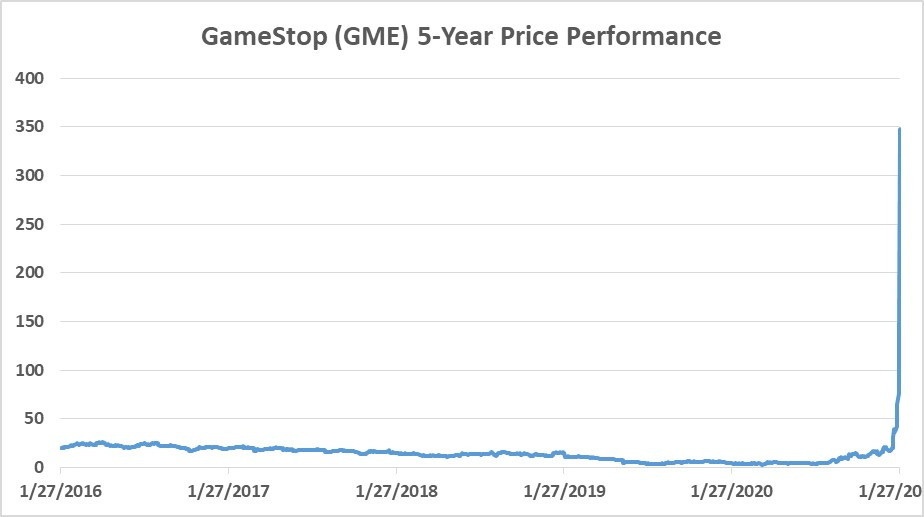 If you’re unfamiliar with GameStop, it is a company that owns thousands of retail stores that buy, sell, and trade physical video game copies, along with gaming accessories and fanboy/fangirl paraphernalia. The stock price fell consistently for years, as sales of video games moved to online streaming. Witness the 5 year chart below: